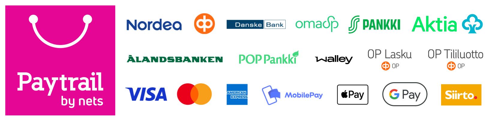 Maksunvälityspalvelun toteuttajana ja maksupalveluntarjoajana toimii Paytrail Oyj (2122839-7) yhteistyössä suomalaisten pankkien ja luottolaitosten kanssa. Paytrail Oyj näkyy maksun saajana tiliotteella tai korttilaskulla ja välittää maksun kauppiaalle. Paytrail Oyj:llä on maksulaitoksen toimilupa. Reklamaatiotapauksissa pyydämme ottamaan ensisijaisesti yhteyttä tuotteen toimittajaan.