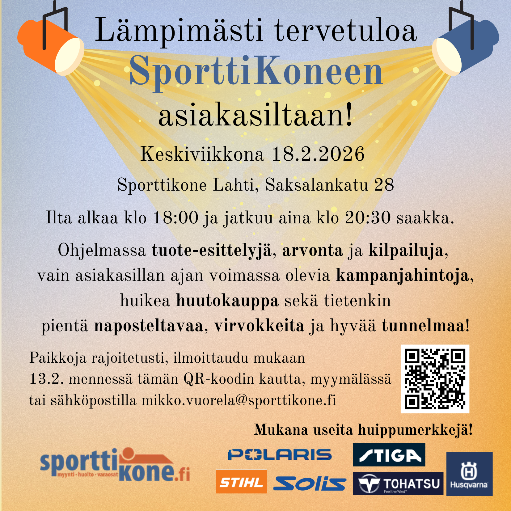 Sporttikone Lahti järjestää asiakasillan ke 18.02. 2026 klo 18.00 - 20.30.
